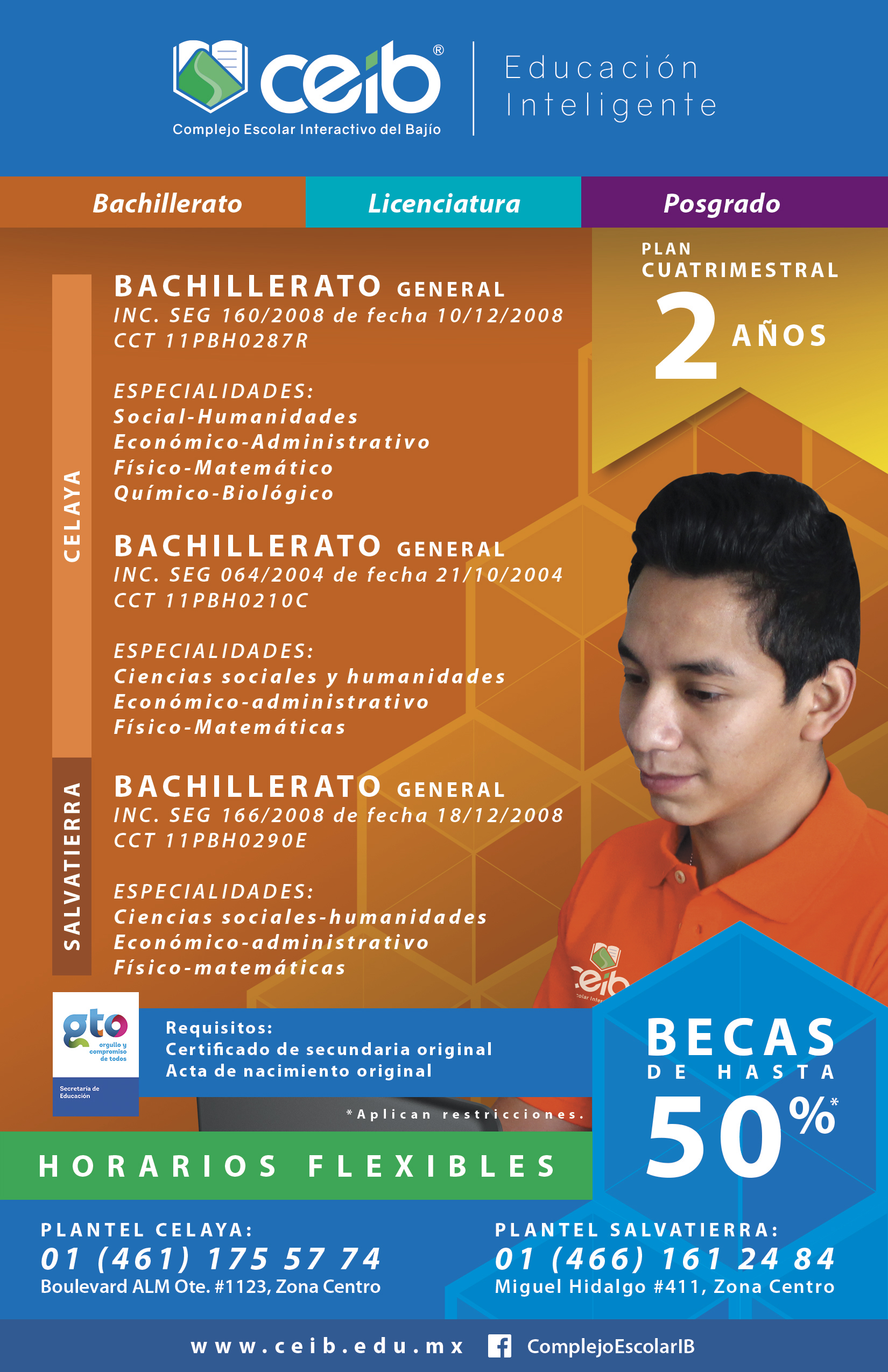 Complejo Escolar Interactivo del Bajío® es una institución educativa de nivel medio superior y superior. Nuestra oferta educativa comprende Bachillerato, Licenciatura y Posgrados. Contamos con una amplia gama de opciones para iniciar o continuar tus estudios, tenemos una opción que se adaptará a tus necesidades.